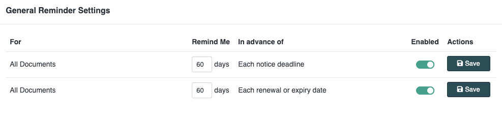 General Reminder Settings are used when you wish to create reminders for all contracts which have a contract term set:
